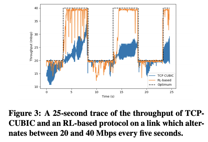 - network condition ( link capacities, packet loss rates, end-to-end latency)는 dynamic 하고 시간에 따라 크게 변한다 ( moblie/cellular network). TCP는 이런 다양한 network comdtions에 적응하는데 매우 나쁜 성능을 보인다. 위 그래프는 link capacity가 5초마다 20 Mbps, 40 Mbps를 오가는 환경을 나타내며, TCP Cubic 이 capacity를 효율적으로 사용하지 못하는 반면, RL을 적용한 방식은 optimum에 근접함을 알 수 있다. 직관적으로 RL protocol은 급격한 packet loss의 급격한 증가와 (bandwidth 20 Mbps), 20 Mbps를 넘는 전송률에서 손실이 발생하지 않는 경우 (bandwidth 40 Mbps)에 대해 학습할 수 있다.