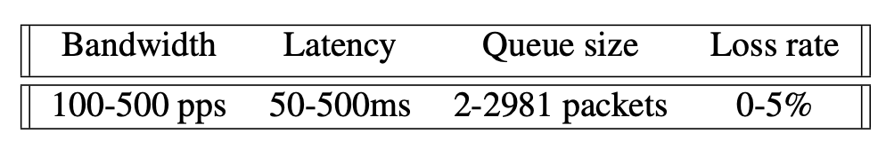 Link 초기화 세팅 ( 위 범위에서 random하게 설정 ) - FIFO queue 기반에 Pantheon의 4가지 parameter 포함: bandwidth, latency, random loss rate, queue size.