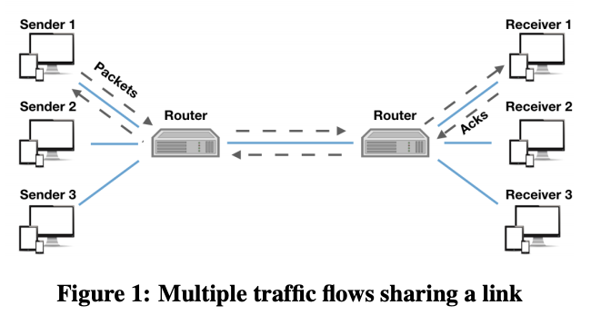 - multiple connections 이 single communication link를 공유하고 각 connection은 traffic sender와 traffic receiver로 구성된다. sender는 data packet을 보내고, recevier로 부터 packet acknowledgements (ACKs)라는 feedback을 지속적으로 받는다. sender는 이 feedback을 토대로 transmisson rate(전송률)을 조절하고, 조절하는 방식은 두 end points의 _congestion control protocol _에 의해 결정된다.