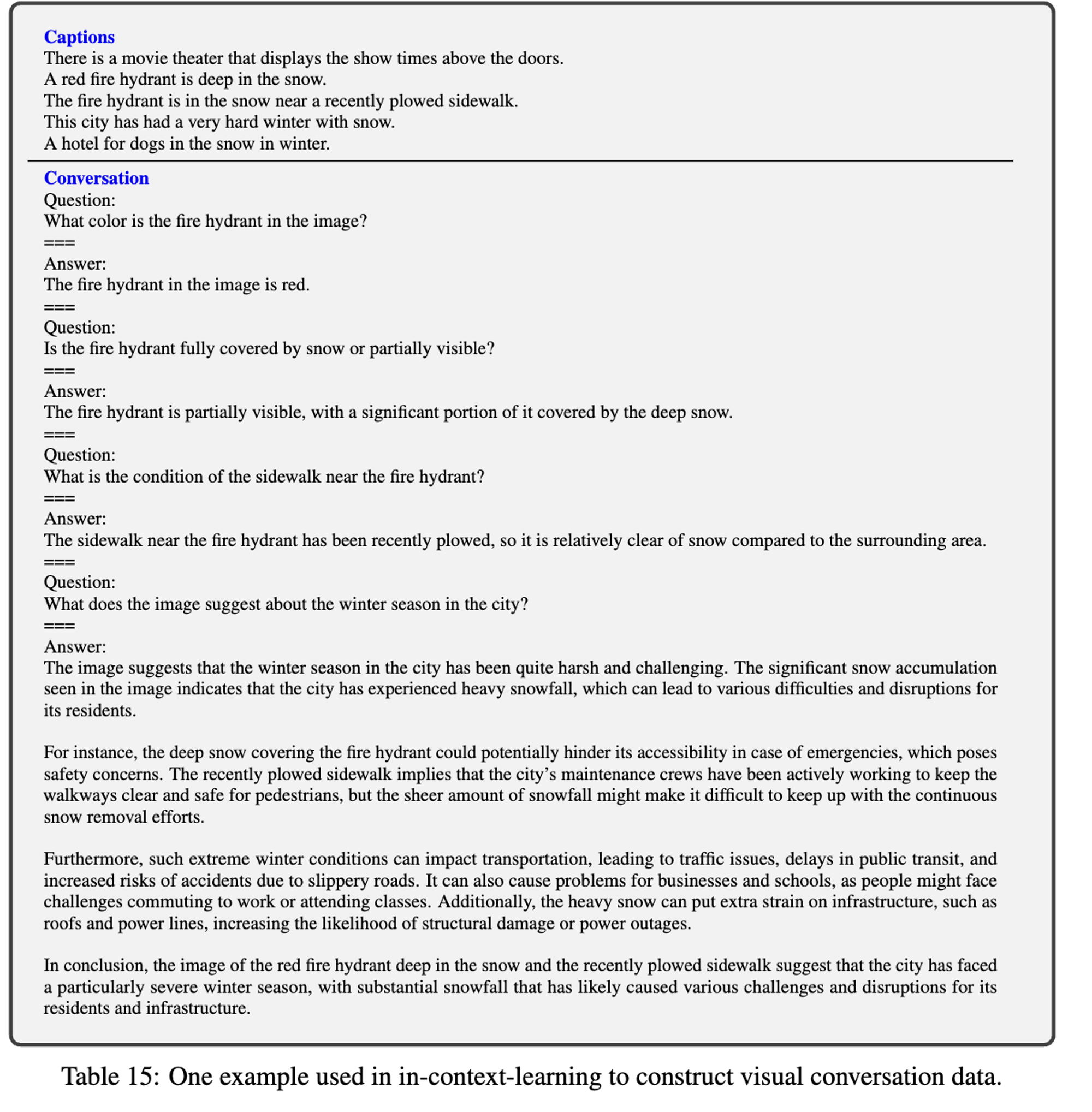 - includes 1. detailed descriptions 2. summarizations 3. question-answer pairs 4. tasks that stimilate creativity or the generation of new ideas 5. conversational tasks